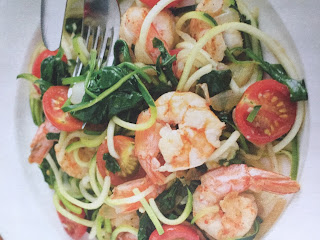 *Verdeel de zoodles over 4 diepe pastaborden,schep hier de groenten en de garnalen op en bestrooi met de resterende basilicum.